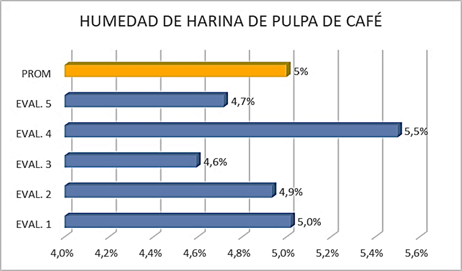 En la Figura 1 se observan los valores de humedad de la harina de pulpa de café, obtenida mediante un proceso de deshidratación en bandejas de 2 kg cada una, a 86 °C durante 8 horas, con rotación manual cada 2 horas para lograr una deshidratación uniforme. Posteriormente, se realizaron cinco evaluaciones de humedad, cuyos valores oscilaron entre 4.6 % y 5.5 %, obteniéndose un promedio de 5 %, un porcentaje adecuado para la molienda y esencial para mantener la calidad y el rendimiento de los productos horneados.