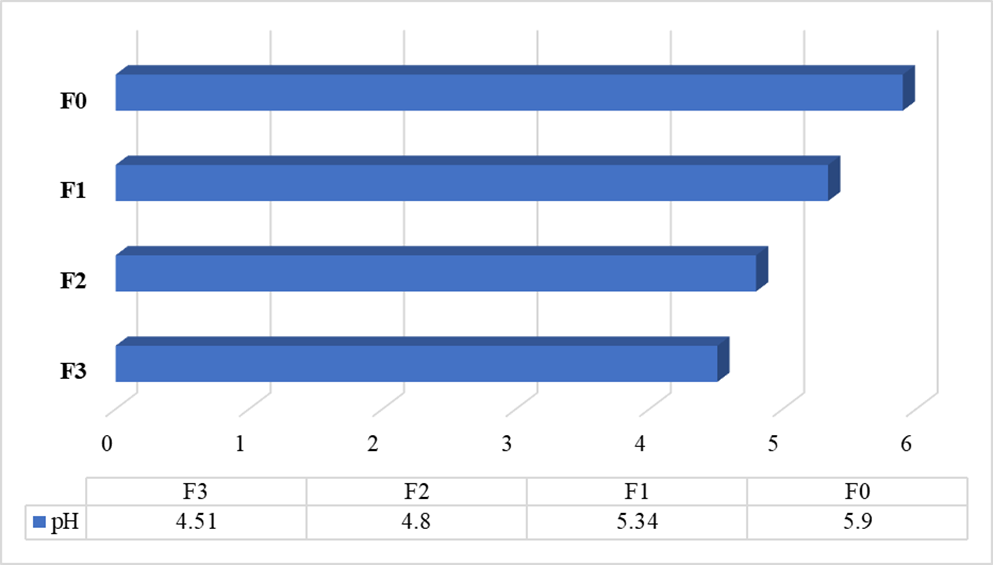 Los análisis de laboratorio mostraron que el pH de las galletas varió entre 4.51 y 5.9, siendo el más bajo el de la formulación con 25 % de sustitución (F3), lo que favorece la estabilidad y prolonga la vida útil del producto. Por otro lado, la galleta con 100% de harina de trigo (F0) presentó el pH más alto, con valores que se mantuvieron en un rango moderadamente ácido. Estos resultados difieren de los de un estudio similar con harina de frejol, en el que la muestra de control presentó un pH más bajo. Según Jiménez (2020), un pH más bajo contribuye a inhibir el crecimiento de microorganismos, lo que resalta la importancia del pH como indicador de calidad y seguridad en productos horneados como las galletas.