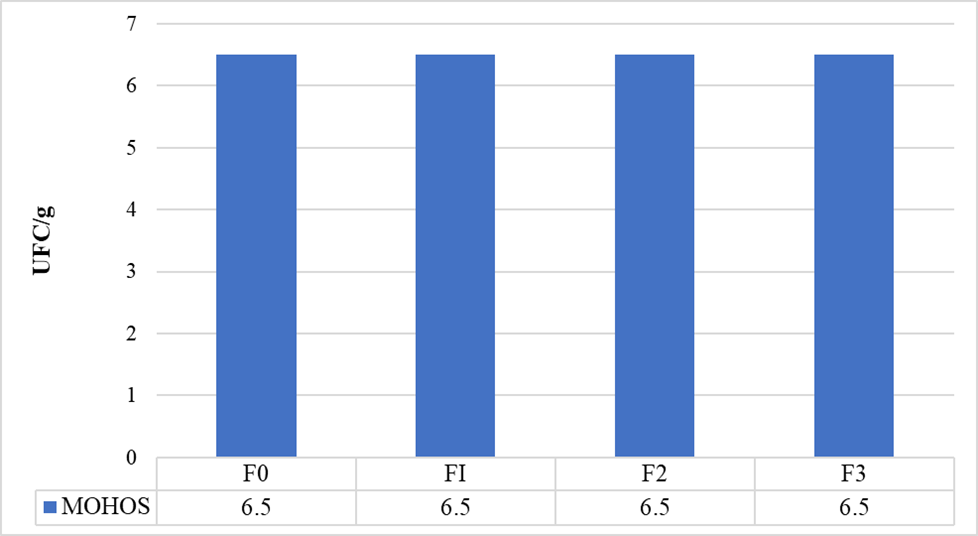 En la Figura 4 se muestran las galletas elaboradas con distintas formulaciones presentaron niveles de mohos por debajo de 10 UFC/g, cumpliendo con lo estipulado por la Resolución Ministerial N.º 591-2008/MINSA, que establece un máximo de 103 UFC/g, lo que confirma su aptitud para el consumo humano. Estos resultados concuerdan con los obtenidos por López et al. (2019) en galletas elaboradas con harina de trigo y de piña, en las que también se observaron valores microbiológicos dentro del rango permitido. En ambos casos, la baja humedad y un proceso de elaboración higiénico contribuyeron a prevenir la proliferación de mohos, favoreciendo la seguridad y la vida útil del producto.