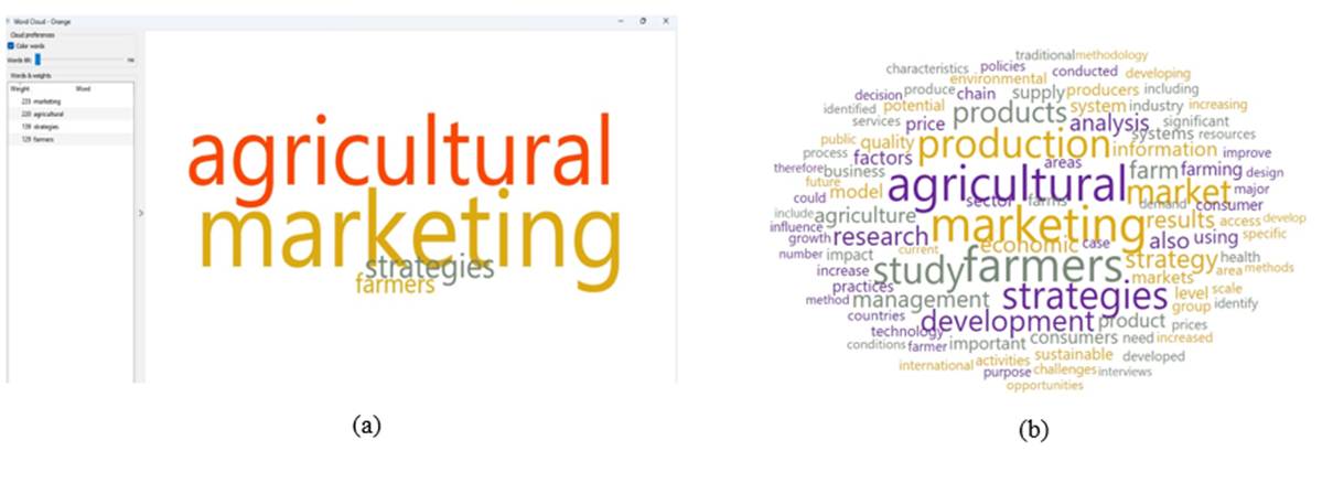 Figura 3. Palabras mas utilizadas en temas de estrategias de comercialización agrícola: (a) en los títulos de los artículos, (b) en los resúmenes de los artículos.