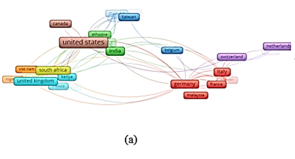 La figura 4a muestra la colaboración de citas entre países en la investigación de estrategias de comercialización agrícola. Estados Unidos destaca con la mayor participación, seguido por Sudáfrica y Alemania. En contraste, países como Etiopía y Francia tienen menor participación. La figura 4b revela la colaboración entre autores de diferentes países, con Estados Unidos teniendo relaciones directas con India, Alemania, entre otros.