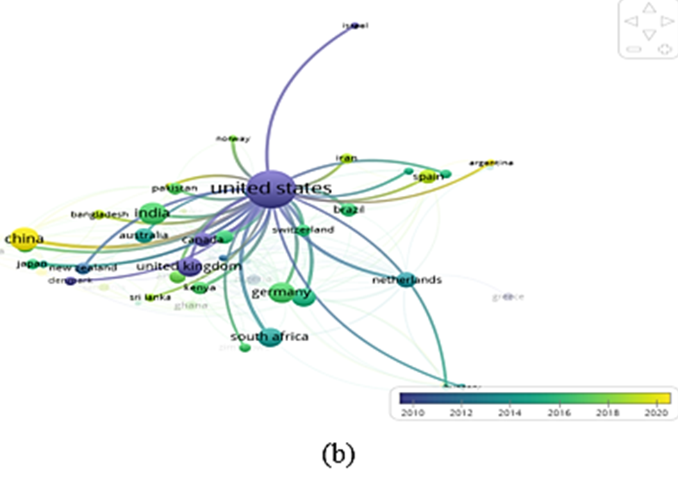 Figura 4. Colaboración entre países en estrategias de comercialización agrícola: (a) citas entre países, (b) colaboración de autores entre países.